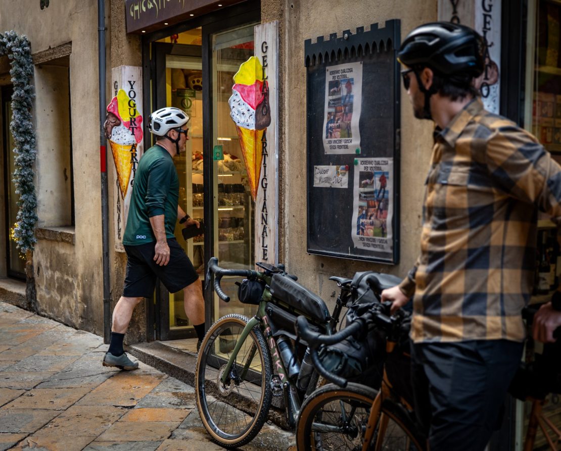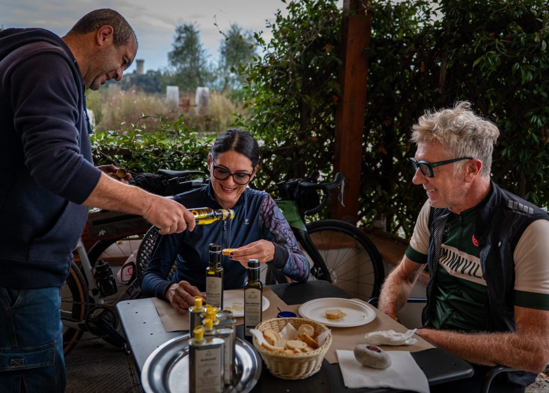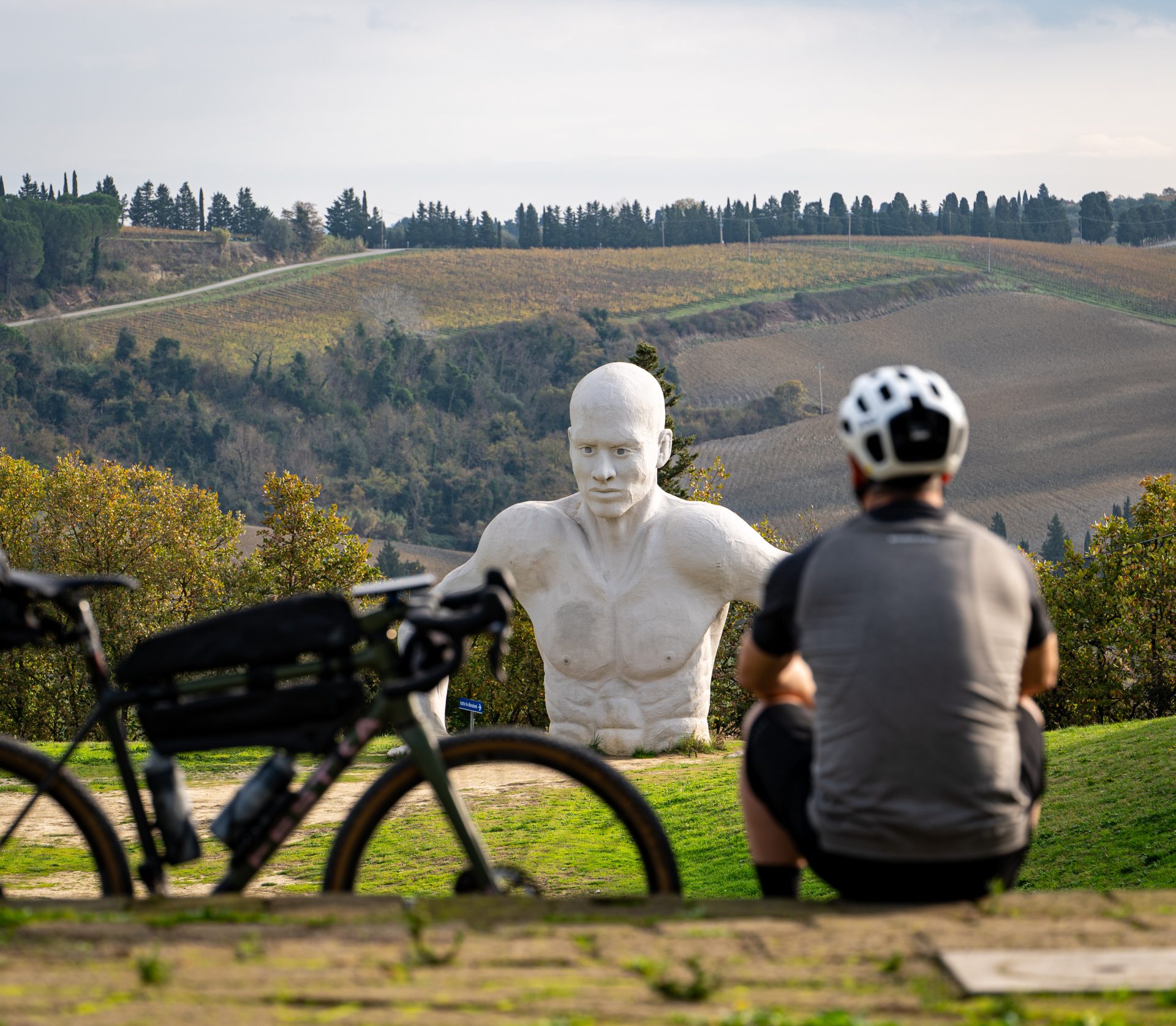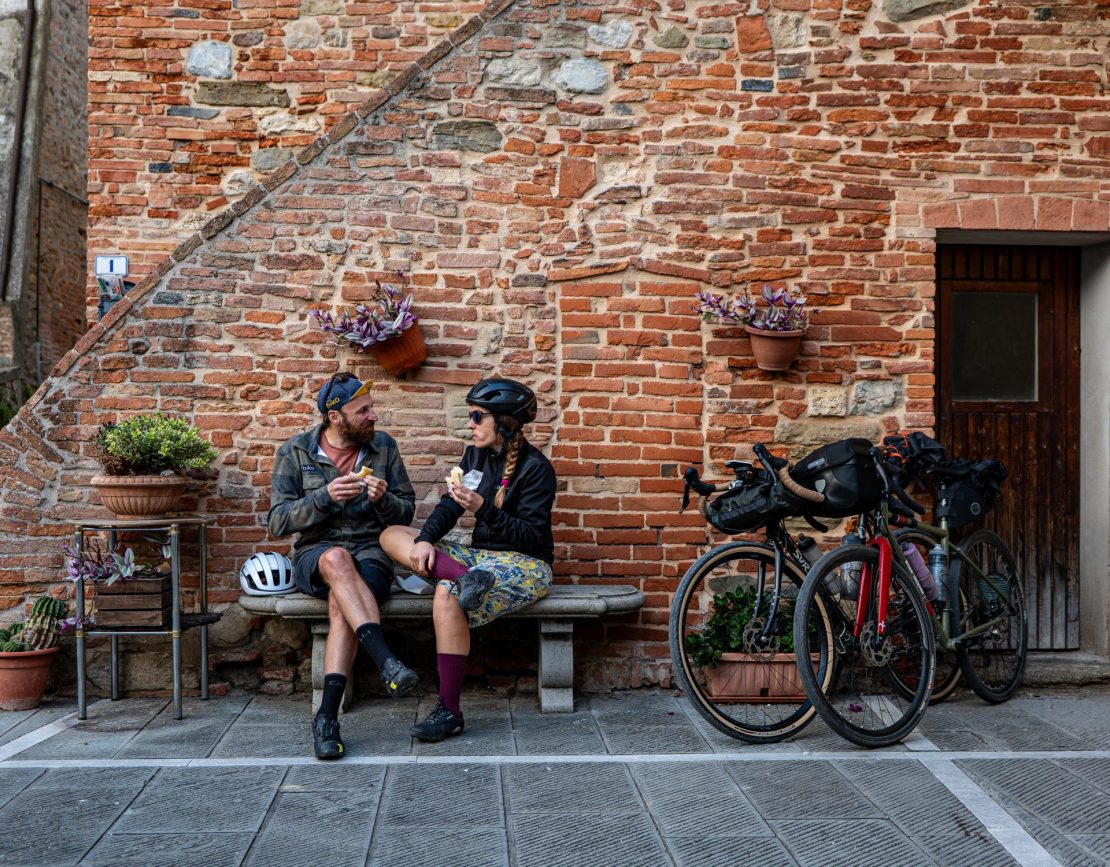 Pedalare qui significa attraversare borghi medievali, tra vicoli silenziosi e piazze assolate. Ogni sosta diventa preziosa: una pausa all’ombra di un palazzo storico, un caffè condiviso sotto i portici, un momento di contemplazione davanti a una pieve romanica.